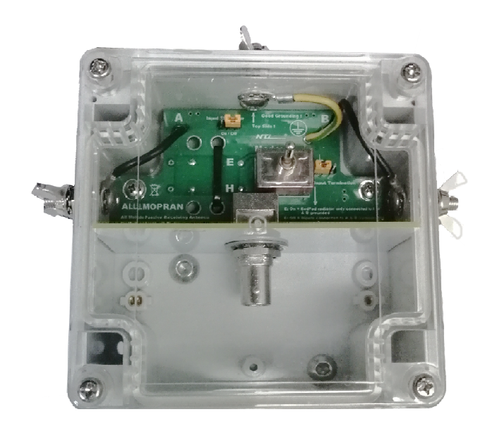 Anpassnetzwerk, ist auch noch Betrieb bis hinunter in den VLF-Bereich möglich. Die BNC-Anschluss-Buchse befindet sich spritzwassergeschützt in einem langlebigen Polycarbonatgehäuse mit transparentem Deckel.